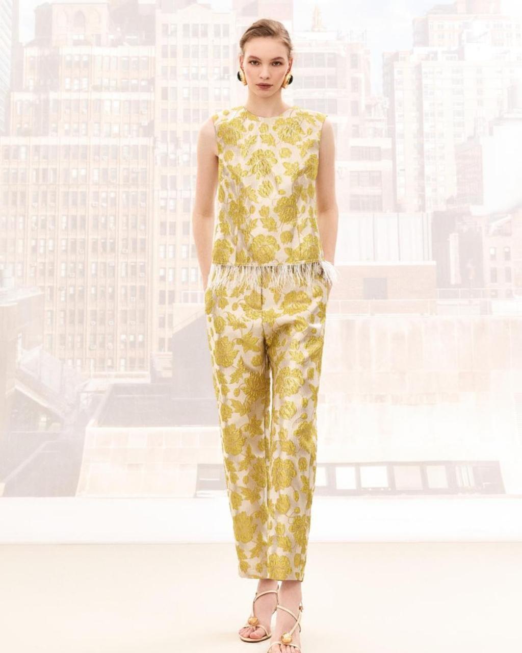 Calça em tecido estruturado com bordado floral em relevo. O fundo perolado contrasta elegantemente com o tom amarelo manteiga das flores, criando um visual sofisticado e contemporâneo. Modelagem reta e cintura alta que valorizam a silhueta, com caimento impecável e toque acetinado. Ideal para compor produções elegantes, combinando com o top ou o corset da mesma coleção.