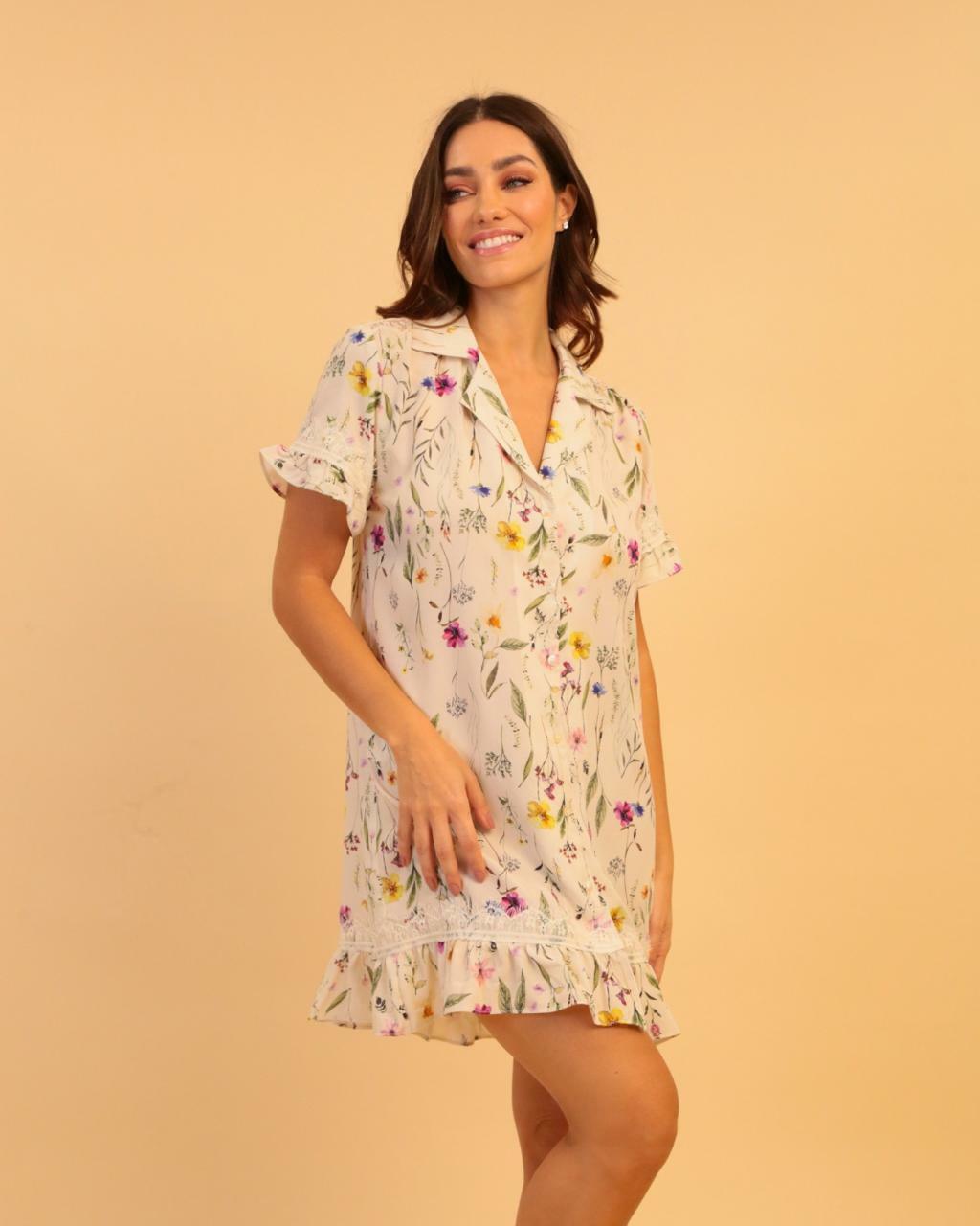 Pijama camisão com estampa floral Sempre Viva, leve e delicado, perfeito para noites confortáveis e cheias de charme. Com modelagem soltinha, gola com lapela e botões frontais, traz um toque clássico ao visual. Os babadinhos nas mangas e barra adicionam feminilidade e romantismo à peça. Ideal para quem valoriza conforto com estilo até na hora de dormir.