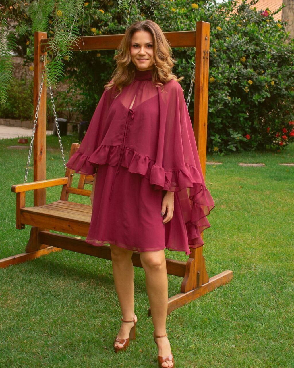 Delicado, sofisticado e cheio de charme é a escolha perfeita para quem busca um look marcante e feminino. O vestido possui alças finas e franzido estratégico, valorizando a silhueta com conforto e elegância. Acompanha uma capa fluida com detalhes em babado, que adiciona movimento e um toque romântico à produção.