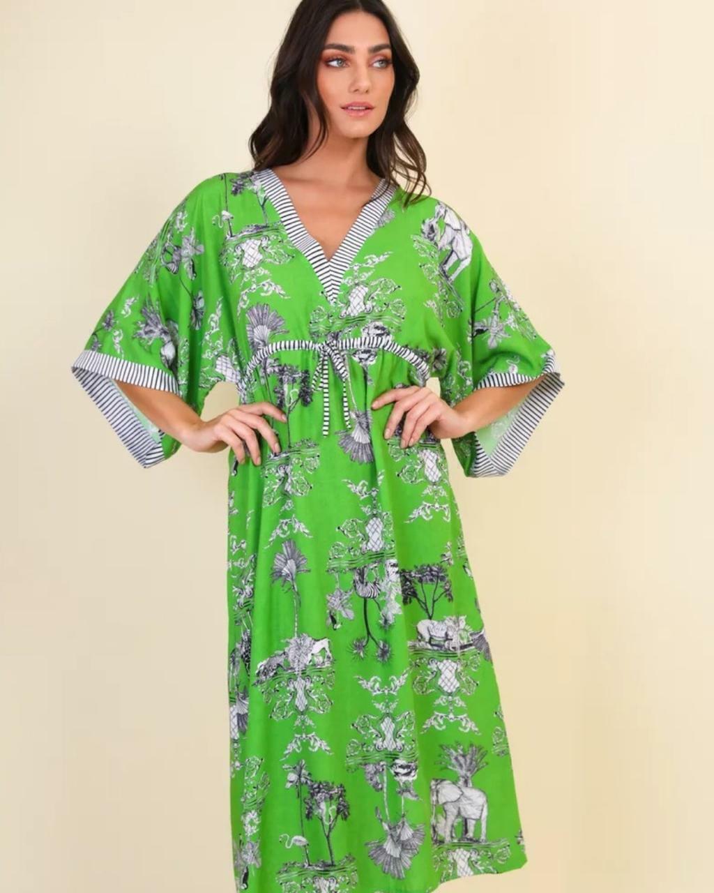 Com inspiração na clássica estampa Toile de Jouy, esta kaftan midi traz uma releitura moderna e vibrante com fundo verde e ilustrações delicadas de animais. A modelagem ampla e fluida proporciona conforto e leveza, enquanto os detalhes em listras contrastantes no decote e nas mangas adicionam um toque contemporâneo à peça. Ideal para momentos de relaxamento com estilo ou para composições casuais sofisticadas.