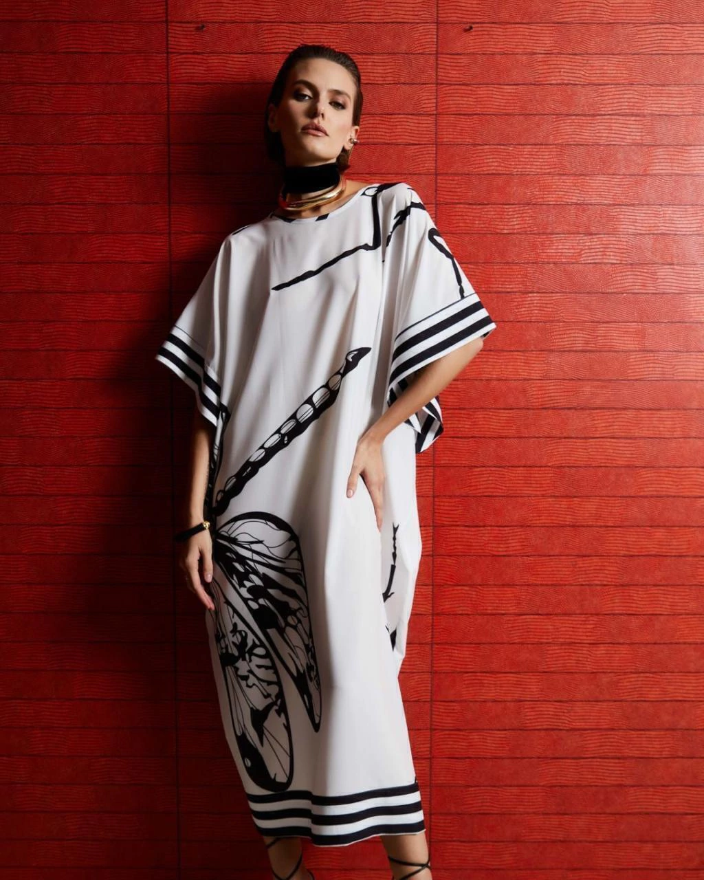Seu design amplo valoriza diferentes silhuetas, enquanto a estampa exclusiva em contraste traz personalidade e um visual contemporâneo e refinado. As mangas amplas e o comprimento midi garantem imponência e versatilidade, tornando a peça ideal tanto para ocasiões especiais quanto para produções urbanas sofisticadas.