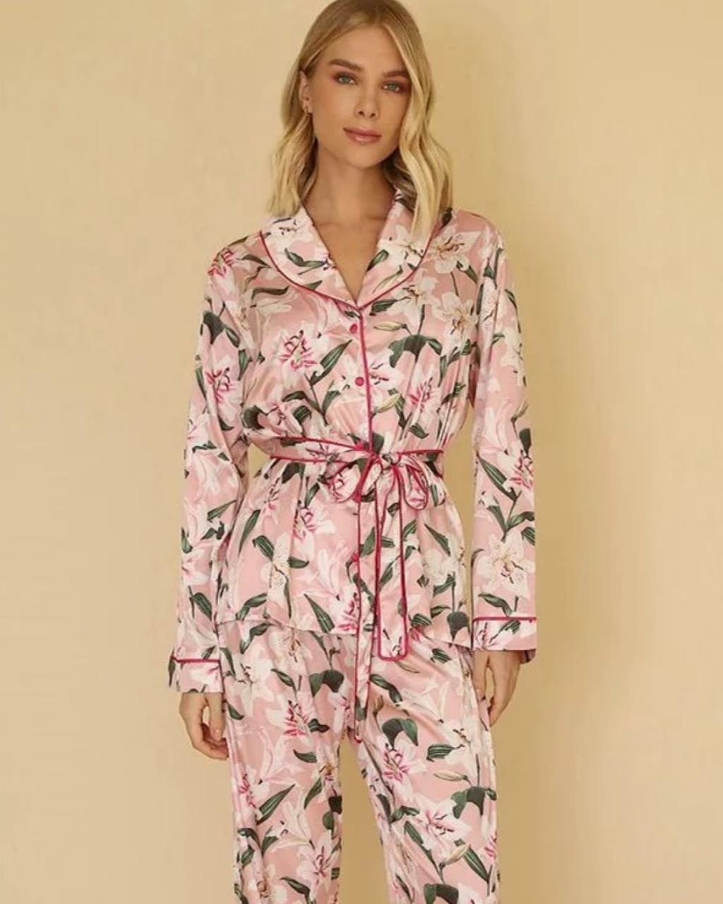 Conforto e elegância se encontram neste pijama longo feminino com estampa exclusiva de lírios. Confeccionado em tecido leve e macio ao toque, o modelo conta com camisa de manga longa, gola clássica e acabamento em vivo contrastante, além de calça reta que garante liberdade nos movimentos. Acompanha cinto para amarração, oferecendo ajuste perfeito à silhueta. Ideal para noites aconchegantes com muito estilo.