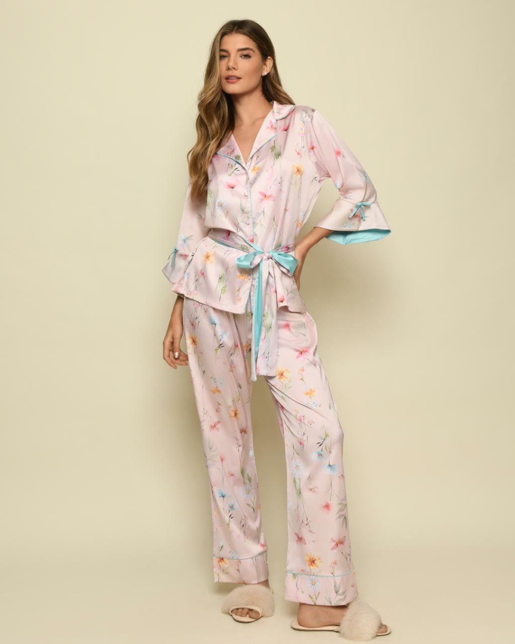 Delicado e sofisticado, esse conjunto de pijama longo em cetim acetinado traz estampa floral suave em tons pastel, com detalhes em azul e acabamento impecável. A modelagem ampla proporciona conforto sem perder a elegância, com amarração na cintura que valoriza a silhueta e mangas 3/4 com um delicado detalhe de laço. Ideal para noites aconchegantes com muito estilo.