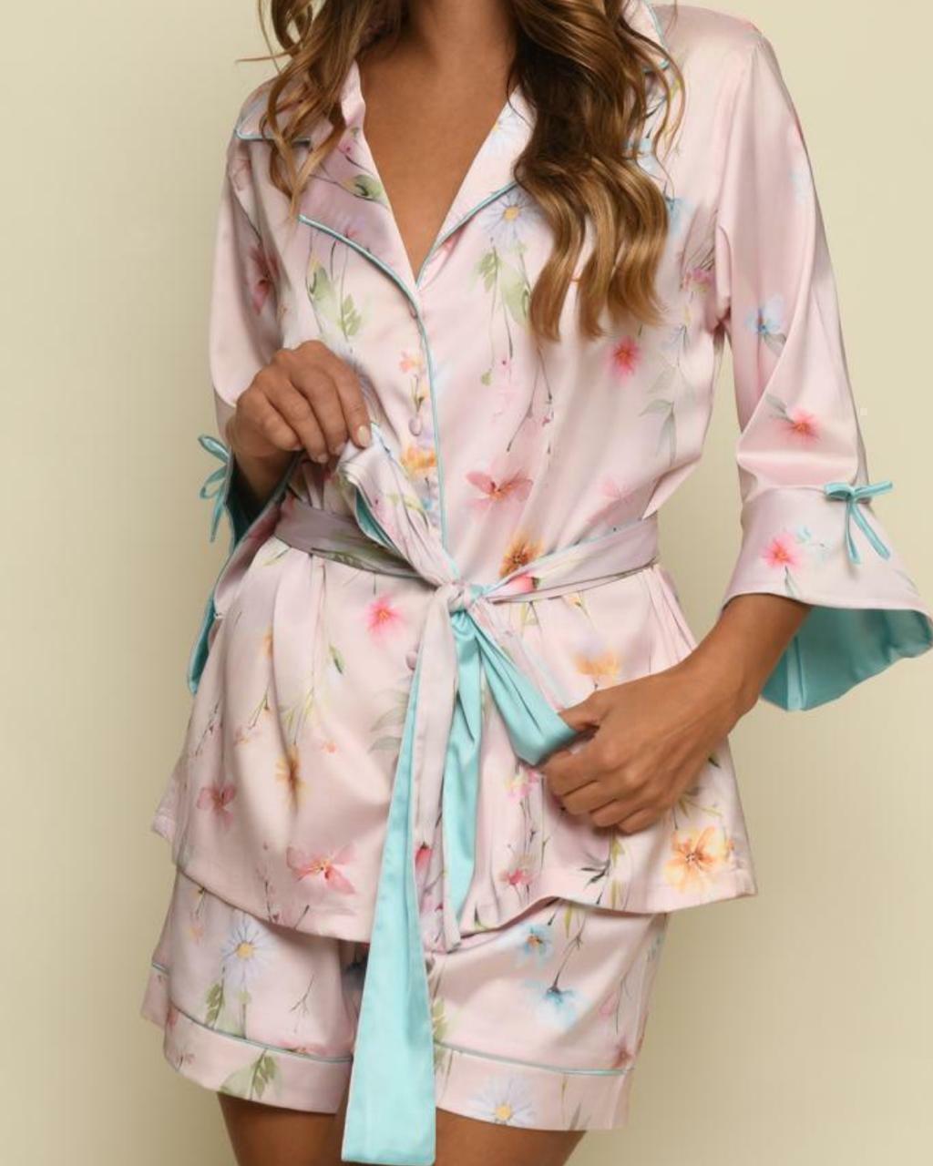 Delicado e sofisticado, esse conjunto em cetim acetinado traz estampa floral suave em tons pastel, com detalhes em azul e acabamento impecável. A modelagem proporciona conforto sem perder a elegância, com amarração na cintura que valoriza a silhueta e mangas 3/4 com delicado detalhe de laço.