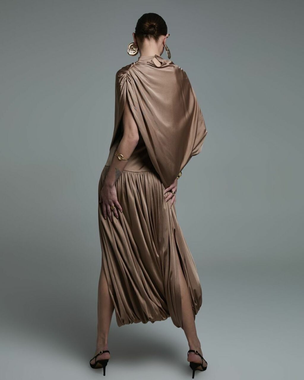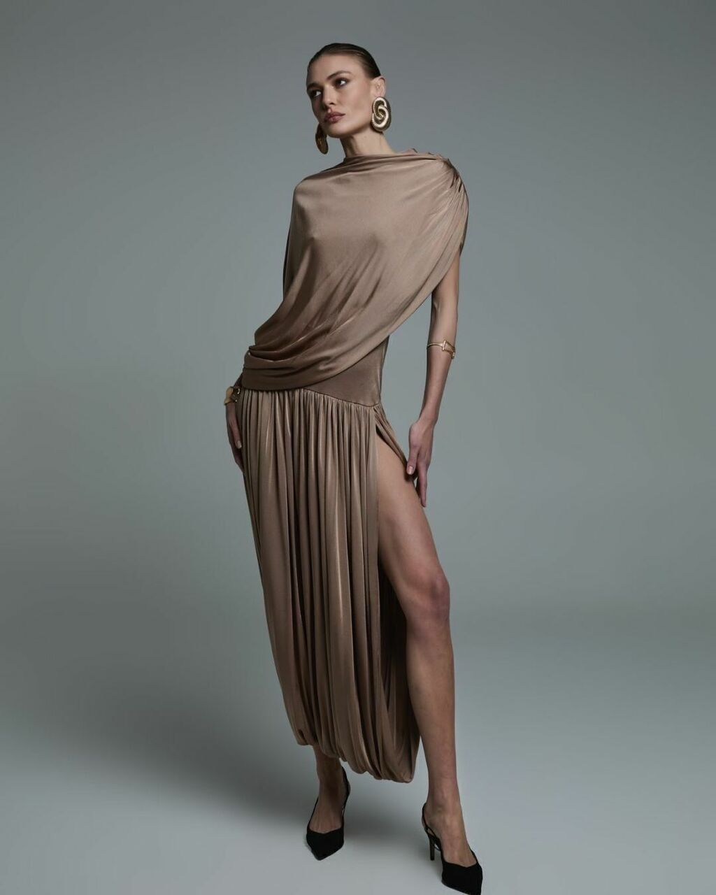 Elegância e conforto se unem neste vestido deslumbrante em jersey com drapeado estratégico. A cor mocha mousse, sofisticada e versátil, valoriza todos os tons de pele e é perfeita para ocasiões especiais ou eventos que pedem um toque de classe. Confeccionado em jersey de alta qualidade, o tecido tem caimento fluCido e toque macio, moldando-se ao corpo com leveza.