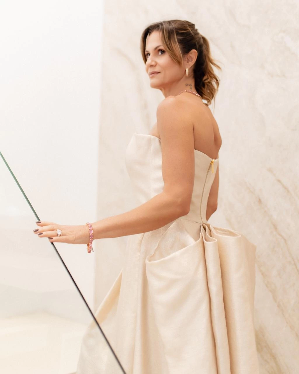 Um vestido que é pura sofisticação. Confeccionado em tecido laminado com toque dourado suave, este modelo exclusivo apresenta design tomara que caia estruturado e pregas amplas que criam volume e movimento impecáveis. A construção elegante destaca a silhueta com modernidade, enquanto o acabamento luminoso confere um ar de luxo atemporal. Perfeito para ocasiões especiais, o vestido combina presença, leveza e um brilho discreto que transforma qualquer entrada em um momento inesquecível.